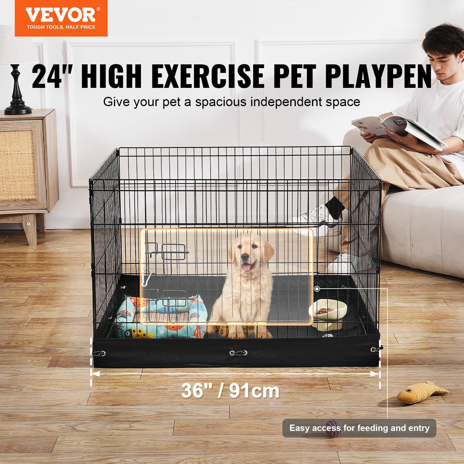 1. Versatile Use: This dog playpen is composed of 4 panels that form a spacious 36" x 36" square. The door opens all the way to the top, allowing easy access for the owner.