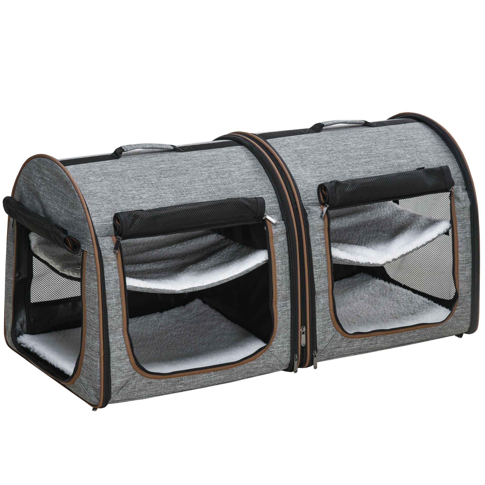 This soft-sided double enclosure vet cat car travel from PawHut can be used as 1 large enclosure or easily divided into 2 smaller areas. Each enclosure space features a large mesh screen for visibility and ventilation. Light, portable, and easy to carry, this collapsible pet travel carrier is complete with carrying strap and handle for added safety for using as a pet booster seat.