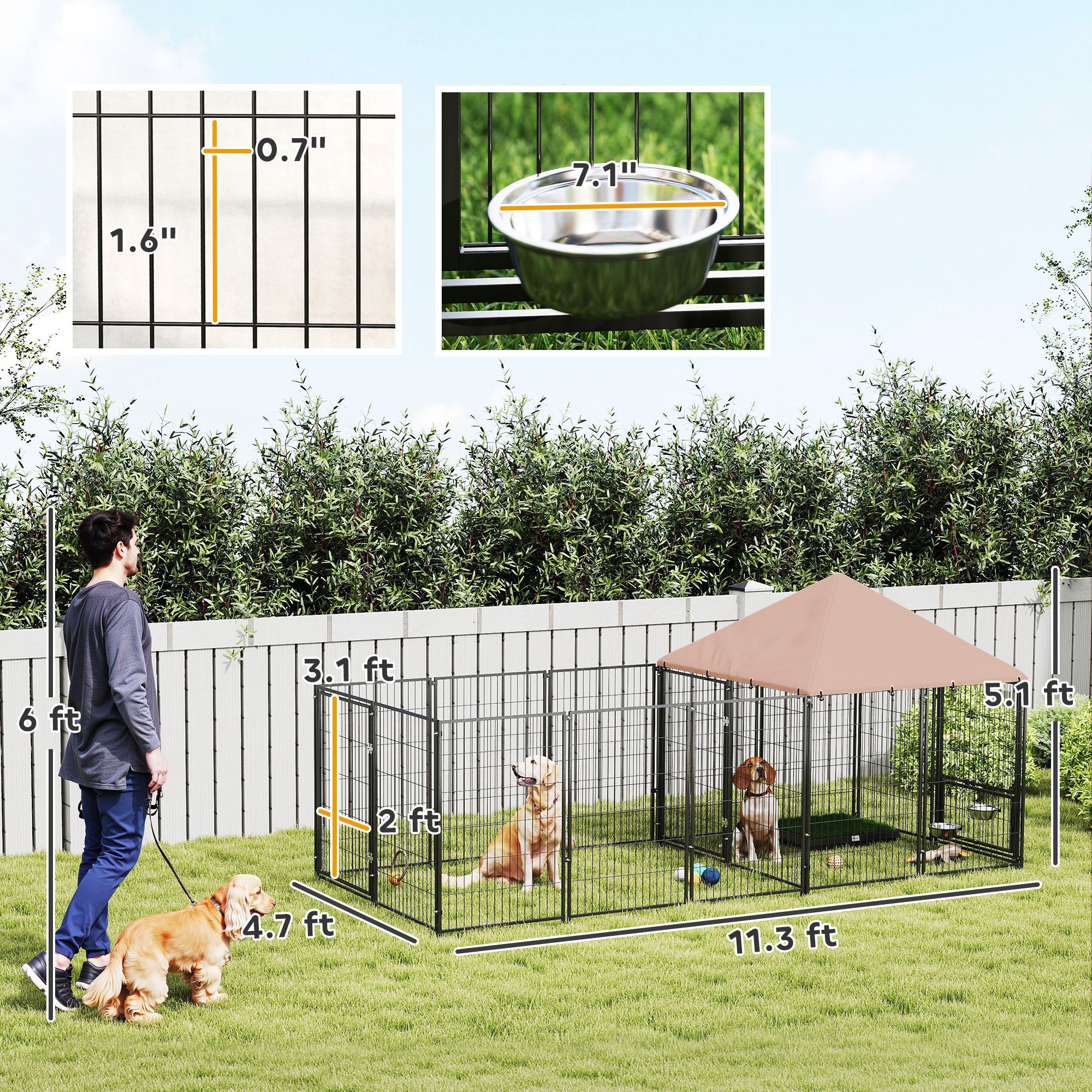 Experience the freedom of a spacious PawHut outside dog kennel. Featuring a private resting room and a large activity area, your pet can enjoy playtime and privacy in one secure space. The robust PVC-coated Oxford fabric provides reliable protection from the elements, while the 360° rotating bowl rack ensures easy hydration access. Suitable for dogs of large sizes and below, this versatile dog lot offers endless opportunities for outdoor fun and relaxation.
