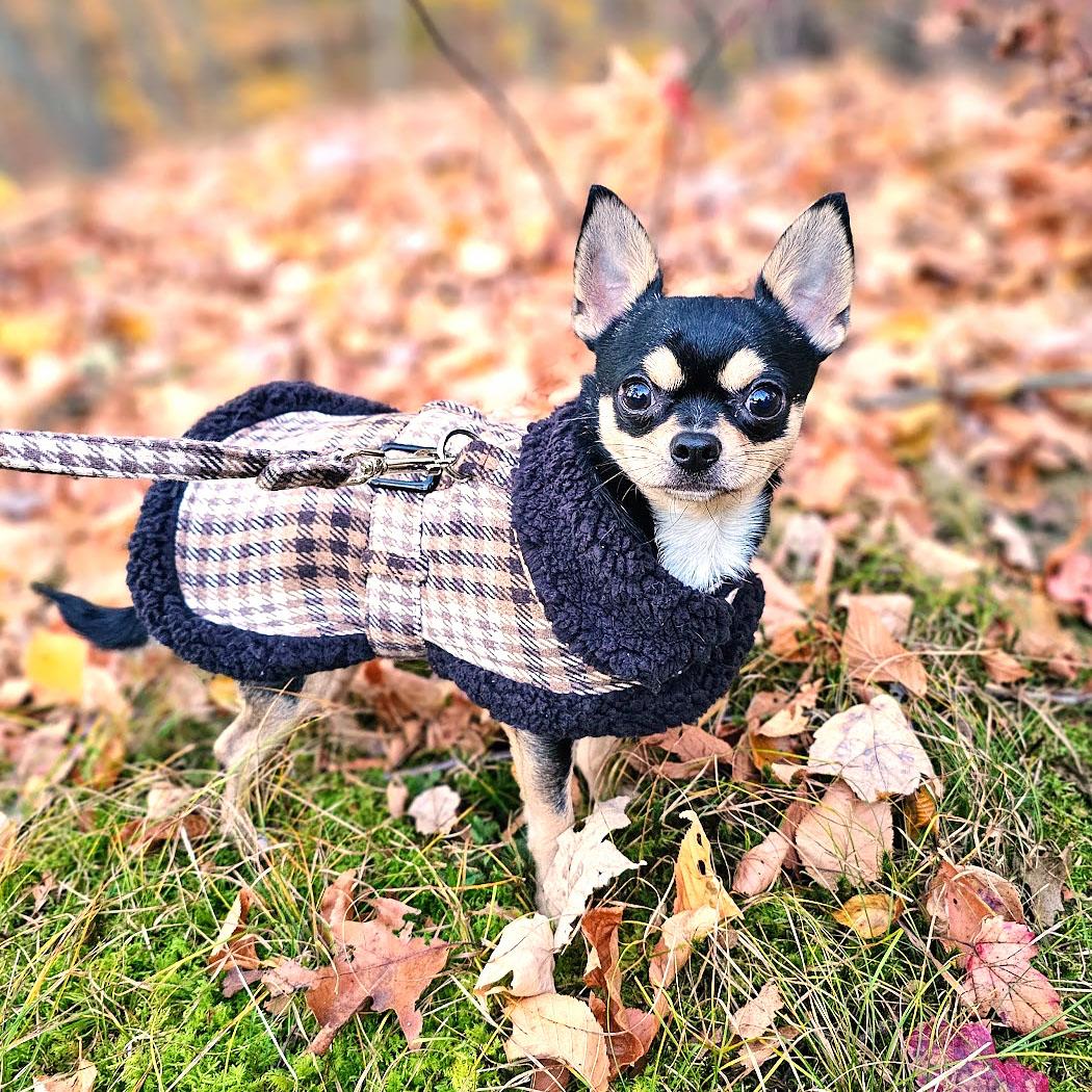 Home > Sherpa-Lined Dog Harness Coat - Brown & White Plaid