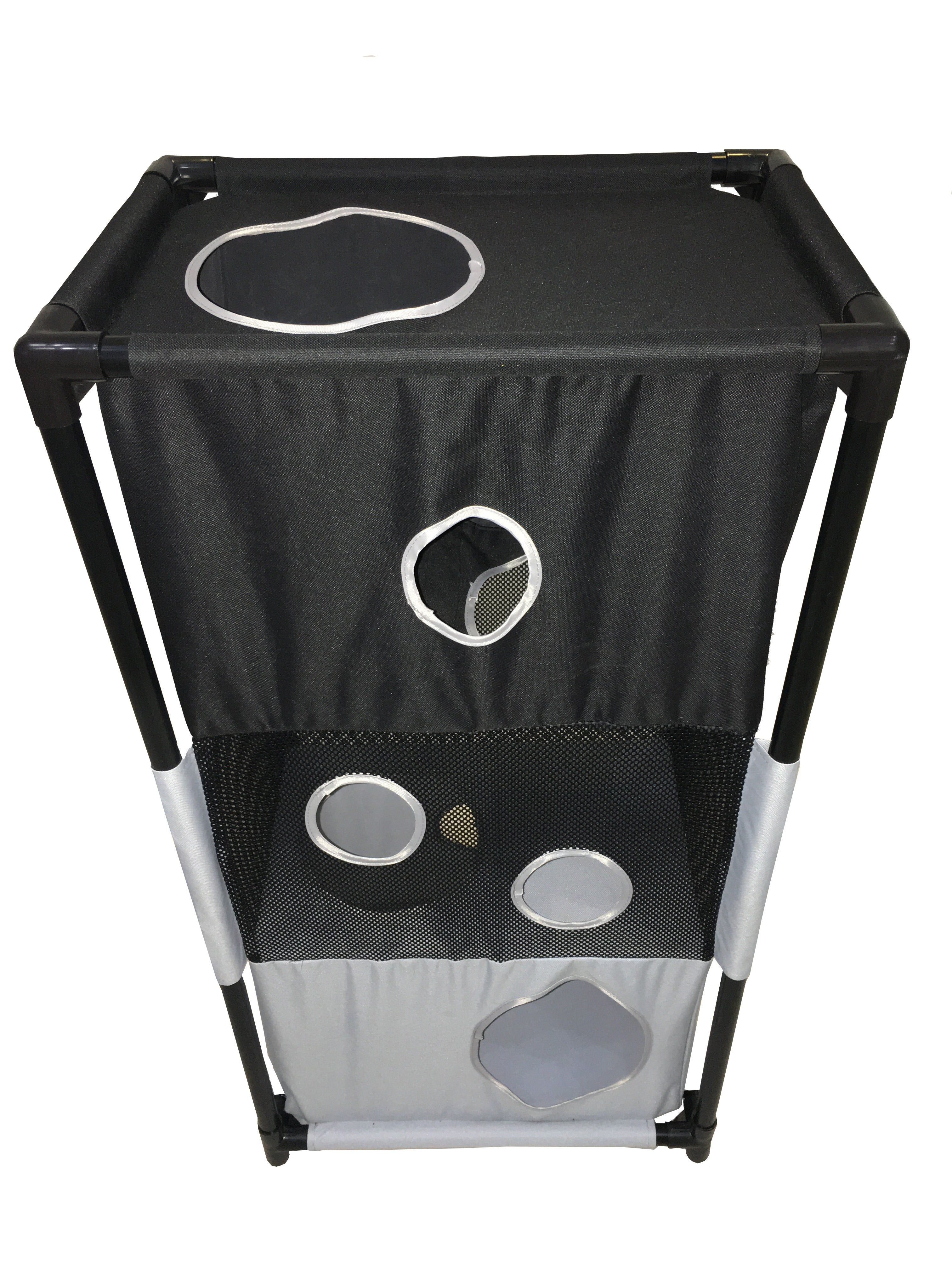 The Pet Life Kitty-Square obstacle soft folding sturdy collapsible travel cat house is composed of durable Ballistic Nylon and Mesh with inner-seat belt webbed stitching for added durability. The Kitty-square features numerous hole entrances at the bottom, mezzanine and top levels. Perfect for Cat Interactive play, this life-sized cat puzzle house is easily collapsible and perfect for traveling and easy setup. Less bulkier than the bulkier conventional cat houses, this cat house is both lightweight and great for storage. Great for multiple cats and great for brain activity development. Assembles in minutes, these poles easily connect into place and sturdy enough to carry up to 200 Lbs. of weight. Perfect for both indoor and outdoor usages. Features 3 levels of playful fun, great for napping or lounging. Available in Multiple Colors.