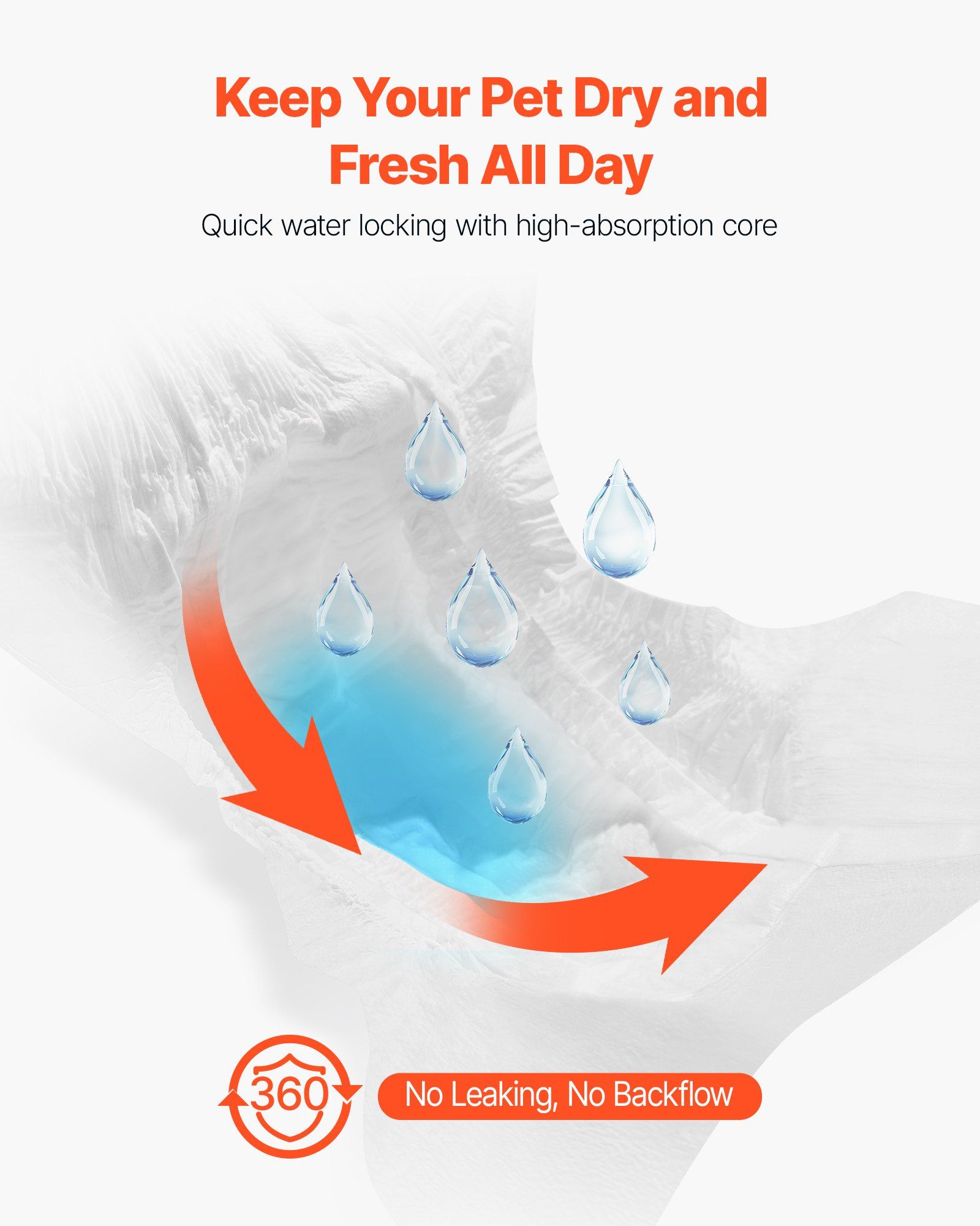 1. Super Absorbent: VEVOR S-sized disposable female dog diapers feature a super absorbent core that quickly locks in liquid, offering 360° leak-proof protection with no backflow. Perfect for dogs in heat cycles, pet training, incontinence, post-surgery recovery, and travel. Suitable Waist Size: 12-20 inches / 30.48 - 50.8 cm